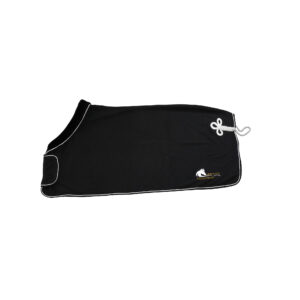 The Absolute Luxe Cooler: Crafted from high-quality fleece, this cooler rug is designed to wick away moisture rapidly after work or bathing, promoting quick drying. Its sleek black design, plush collar, and white piping deliver a premium, sophisticated appearance perfect for show day or stable comfort.